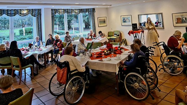 Am Mittwoch begleitete die Sängerin Andrea Schröter unsere zweite offizielle Weihnachtsfeier im festlich geschmückten Veranstaltungssaal. Die Bewohner und Bewohnerinnen freuten sich über besinnliche Geschichten, Lieder und ließen sich gerne in weihnachtliche Stimmung versetzen.
