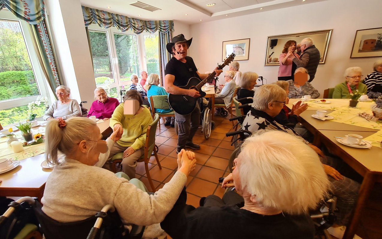 Der “Cowboy aus dem Ruhrgebiet” sorgte mit seiner Gitarre für ausgelassene Stimmung auf unserem Frühlingsfest. Die Damen und Herren des Heinrich-König Seniorenzentrums feierten fröhlich, klatschten und sangen kräftig mit. Einige Bewohner hielt es nicht lange auf ihren Plätzen. Sie tanzten und schunkelten mit den Mitarbeitern und begrüßten den Frühling, trotz schlechten Wetters.