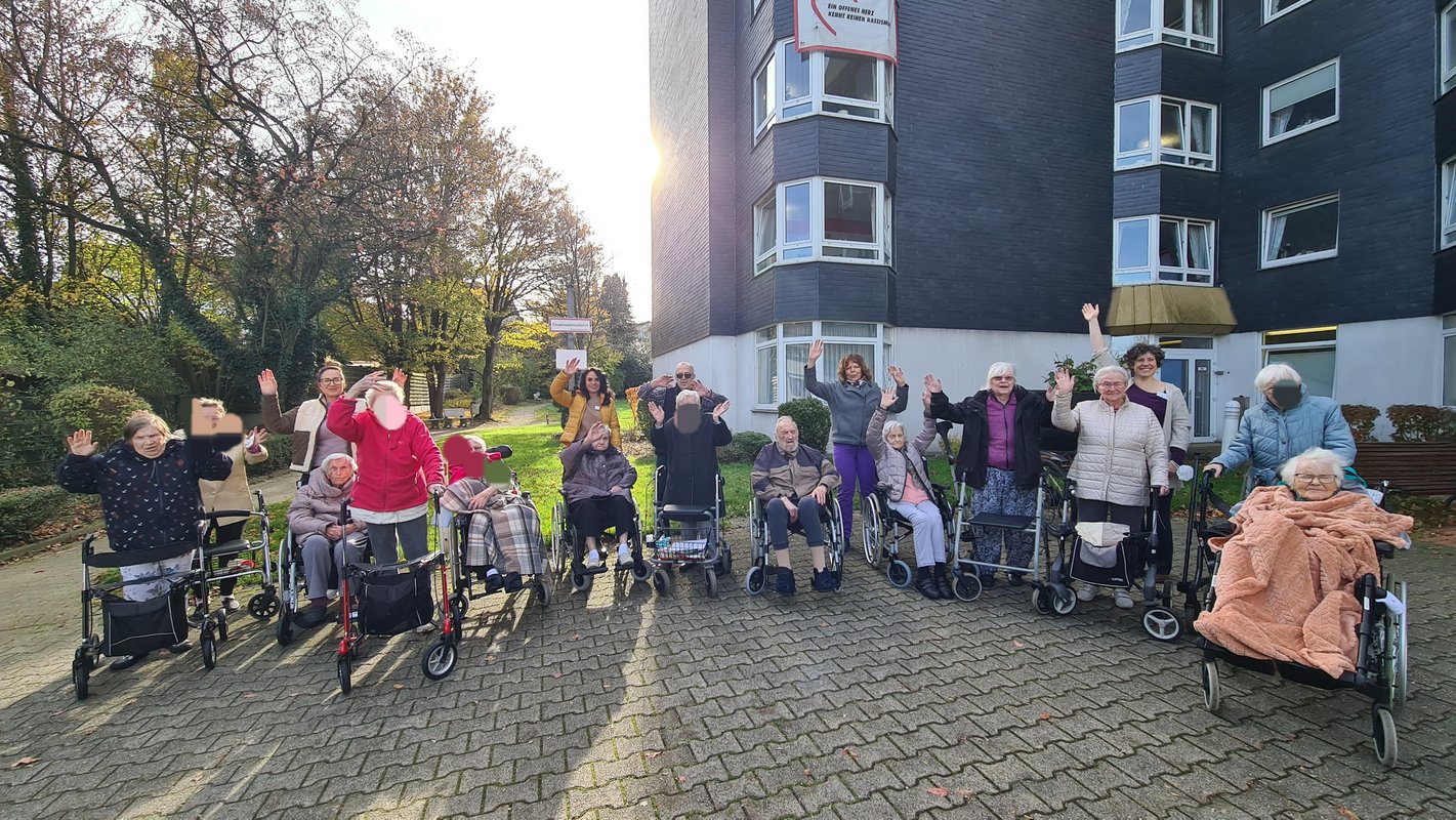 Jeden Donnerstag treffen sich die Bewohner der verschiedenen Wohnbereiche zu einem gemeinsamen Spaziergang durch den Park hinter dem Haus und über den Spielplatz. Bei schlechtem Wetter treffen wir uns auf dem großen Gemeinschaftsbalkon auf Wohnbereich 1.